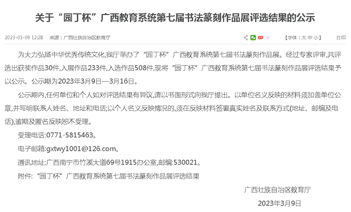 莫金蓓同学在“园丁杯”广西教育系统第七届书法篆刻作品展中获奖