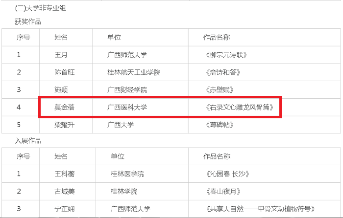 【喜讯】2020级临床医学8班莫金蓓在“园丁杯”广西教育系统第七届书法篆刻作品展评选中喜获佳绩