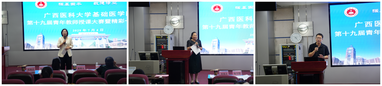 比赛现场,来自学院各教研室的11位青年教师同台竞技。他们从教学内容的设计,到AI技术的应用,再到课程思政元素的融入,每一个教学环节都经过反复打磨,为大家呈现了一场精彩纷呈的教学展示,赢得了评委与观摩教师的一致好评。在评委点评环节,管茶香教授从教学设计的层面,温丽华副部长从课程思政切入的维度,刘震副主任从基础与临床融合的视角,分别进行了全面且细致的点评。专家们在充分肯定参赛教师出色表现的同时,也针对教学过程中的细节问题提出了建设性意见,为青年教师的专业成长指明方向。组织学与胚胎学教研室岳晓阳老师和寄生虫学教研室何姗姗老师荣获一等奖,4位老师荣获二等奖,5位老师荣获三等奖。