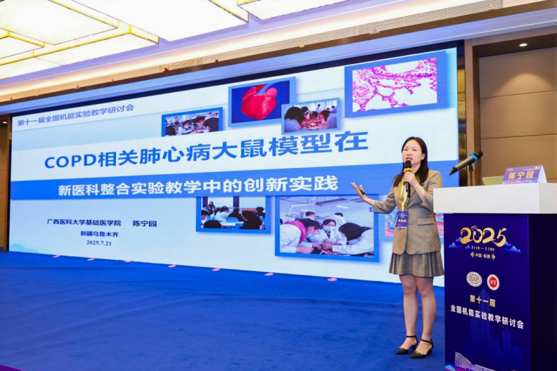 大会报告环节,陈宁园作题为《“临床-基础”双轨驱动:COPD相关肺心病大鼠模型在新医科整合实验教学中的创新实践》的主题报告。她提出的“临床-基础”双轨驱动模式,通过COPD大鼠模型将真实病例融入实验教学环节,有效提升学生科研与临床融合的能力。这一创新举措引发与会专家热烈讨论,并获得高度评价。