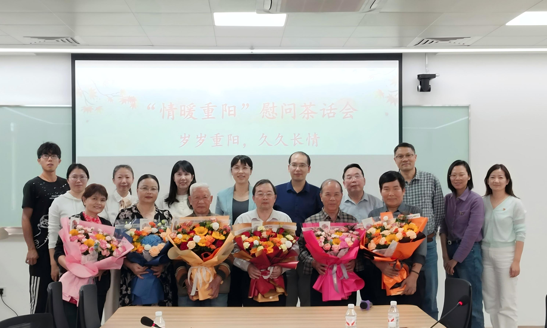 罗彬代表学院向离退休老同志们送上了诚挚的问候与美好的祝福,对老同志们长期以来为学院建设与发展所作出的贡献表示衷心的感谢和崇高的敬意,指出老同志们是学院的宝贵财富,是学院发展的奠基者和见证人,学院今日的成就凝聚着老同志们的心血与智慧。随后,罗彬、王闻楚与教研室代表向在场每位退休老同志们敬献鲜花并合影,活动现场温馨祥和,充满了欢声笑语。茶叙交流环节中,离退休老教师分享了当年的教学、科研经历以及退休生活,在轻松氛围里,与会人员交流互动,增进感情,共同挖掘学院发展的宝贵经验。